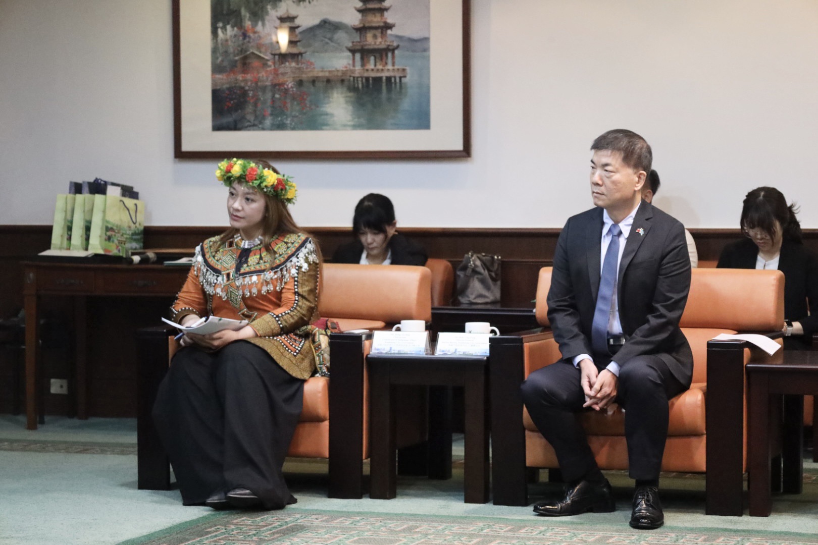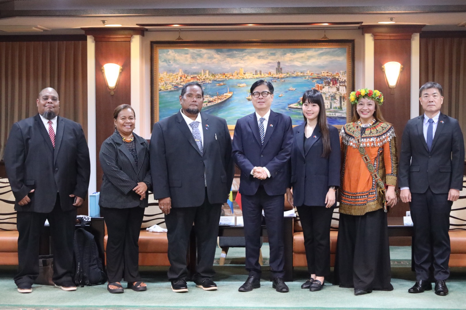 我們的姊妹市帛琉科羅州的州長艾約斯魯迪姆奇 (Eyos Rudimch) 首次率團訪高, 市長陳其邁、行國處長張硯卿、海洋局長石慶豐和本會主委洪布斯共同接待。邁市長分享帛琉是浮潛天堂,自己則是去過帛琉最多次的市長。科羅州有1.3萬人,與阿美族同為母系社會,在海洋生活方式及語言單詞上多有相似處,真是南島一家親! 帛琉共和國無私分享號將在3/7下午駛進高雄港,在愛河灣鯨魚堤岸O2館旁舉辦迎船儀式,歡迎市民朋友前往體驗傳統航海文化盛典!