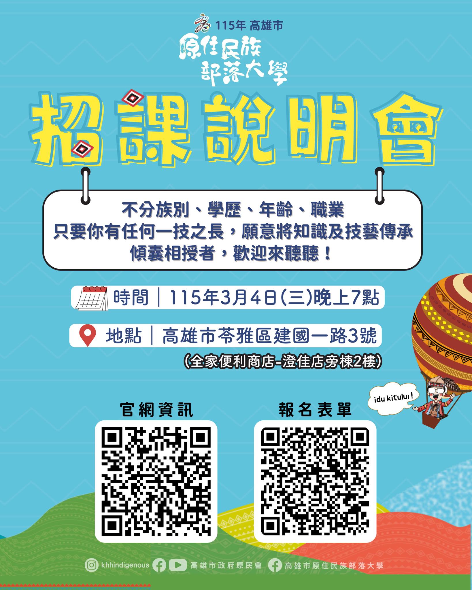 【部落大學】115年高雄市原住民族部落大學-招課開跑囉!~敬請眾教師/單位踴躍投課~ |